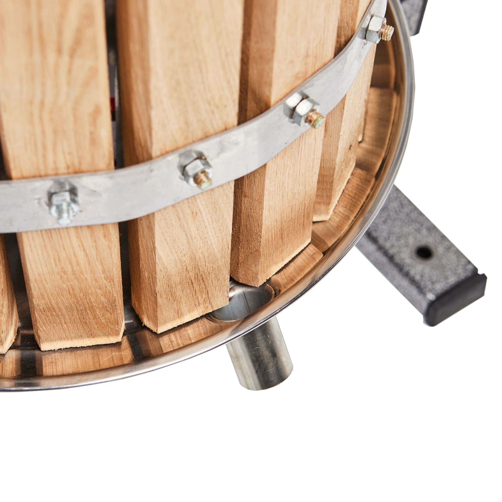 Данный агрегат представляет собой деревянную дубовую кадку, скрепленную металлическими обручами с поршнем, отжимающим жидкость. Поршень ввинчивается ручным способом методом вращения. Прижимной диск плотно пристает к корзине, обеспечивая качественный отжим. Вся конструкция винтового пресса установлена на прочную раму, устойчива и надежна. Выжатый сок или сыроватка фильтруются через ткань и стекают в поддон. Устройство позволяет собрать за одну операцию до 30л жидкости.