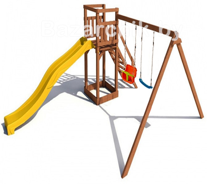 Отличный детский игровой комплекс с пластиковым скатом и двумя качелями для младшего детского возраста - Standart и Baby Luxe. Конструкция комплекса представляет собой деревянную игровую башню с лестницей, песочницей пластиковым скатом с возможностью подключения воды, стойкой для качелей или других аксессуаров для детской площадки - веревочной лестницы, каната, гимнастических колец и т.д. Скат пластиковый устанавливается на высоту 150 см. Цвет качелей и ската можно выбрать любой из представленных на сайте.