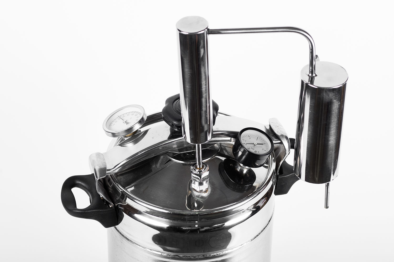 «Домашний погребок 2в1 ». Как он работает: 1. В банки уложить сырые ингредиенты; 2. Закатать банки; 3. Загрузить их в автоклав; 4. Залить в автоклав воды (выше уровня банок на 2 см); 5. Поставить автоклав для консервирования на плиту и периодически следить за температурой в нем. Вот так просто и непринужденно через несколько часов можно получить консервы превосходного качества. «Домашний погребок» не зря называется «2в1», ведь он выполняет функции не только стерилизатора, но и дистиллятора.