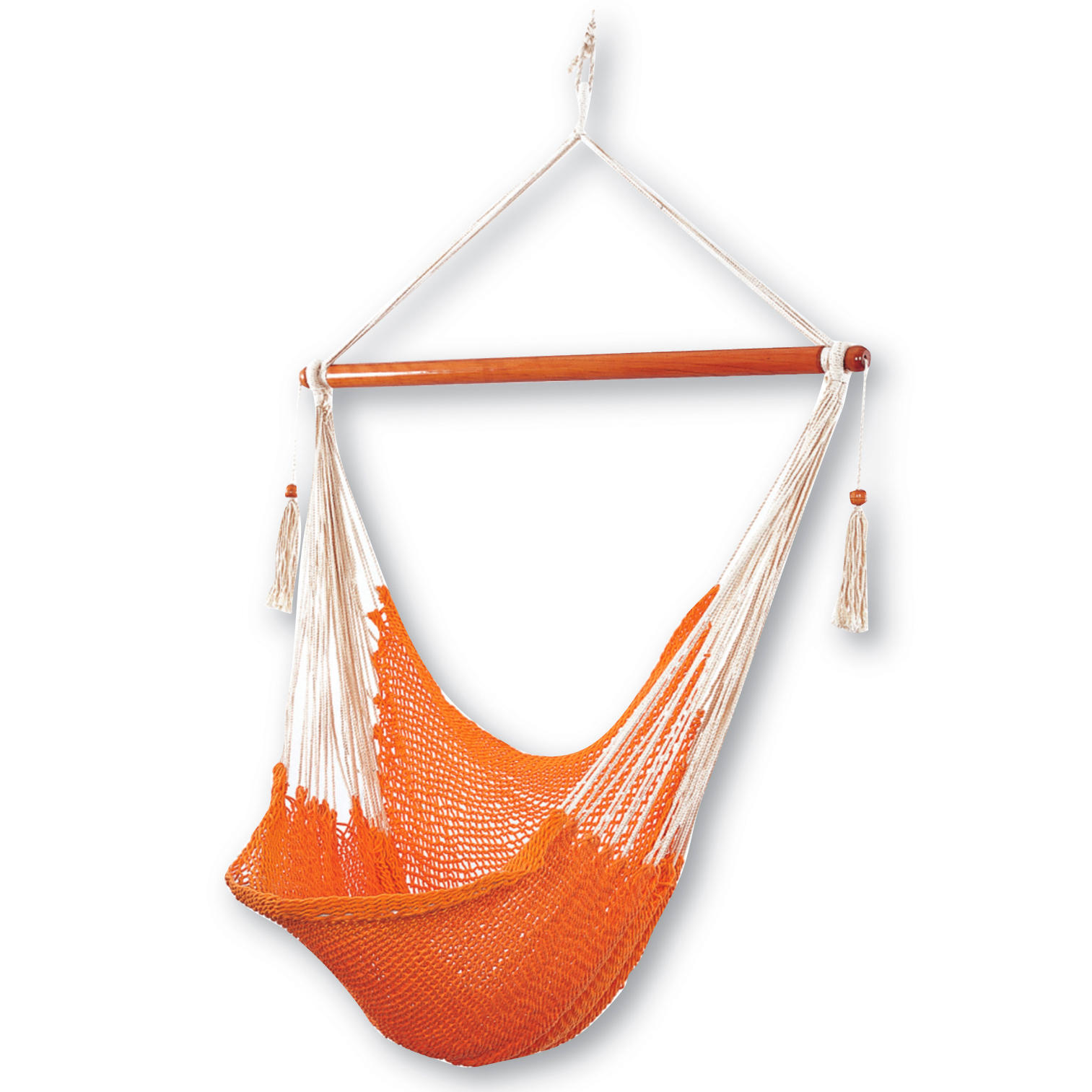 Гамак в виде тканого подвесного кресла оранжевого цветов подарит вам не только комфортный отдых, но и позитивное настроение своей яркой цветовой гаммой. Конструкция представляет собой плетеную хлопковую сетку, закрепленную на деревянной балке креплением-кольцом для подвешивания в любом удобном для вас месте. Тканое полотно основы дает телу возможность легко принимать расслабленное положение, даже сидя, и читать любимую книгу на свежем воздухе с естественным комфортом.