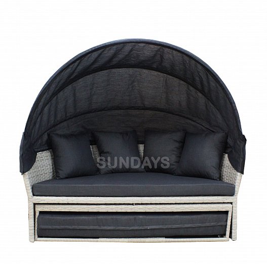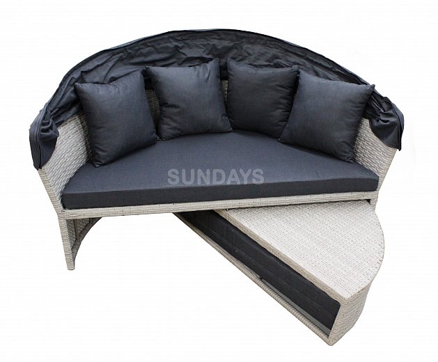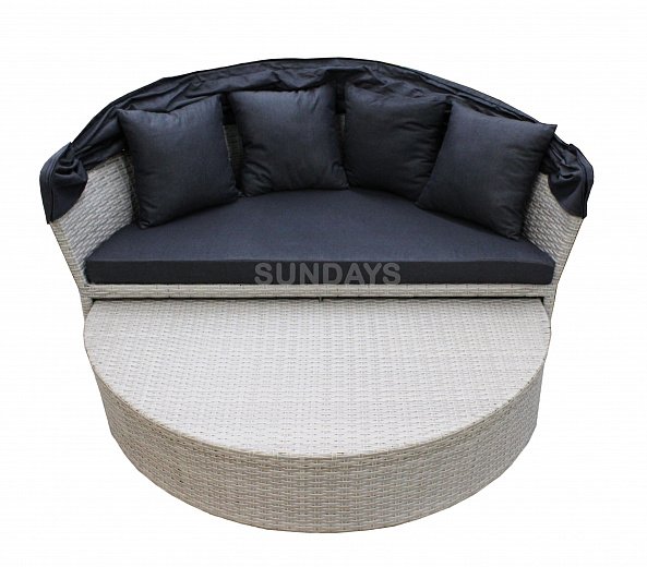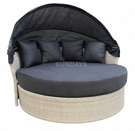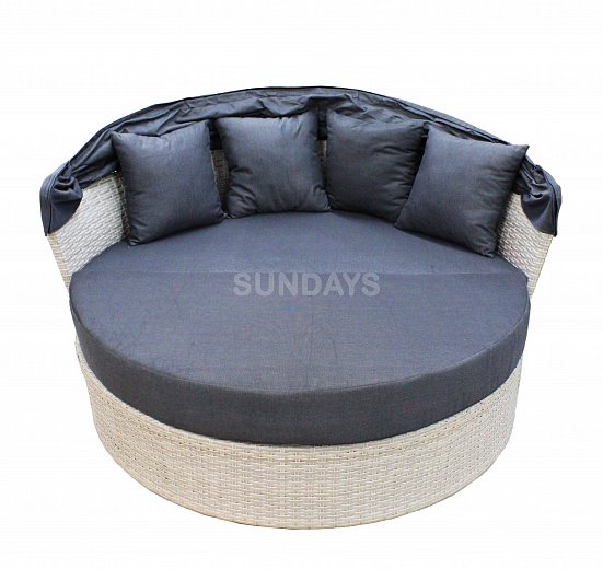 Sundays PATIO HL-B-16006B - это большой круглый садовый диван, каркас которого выполнен из алюминия (это гарантирует многолетнее использование мебели без появления коррозии). Основной материал, который использован при изготовлении Sundays PATIO, это - искусственный ротанг. Данный материал устойчив к различным погодным условиям - не боится влаги, не выгорает на солнце и на долгие годы сохраняет свой первозданный вид. Sundays PATIO HL-B-16006B можно использовать как диван с капюшоном или как большую кровать для нескольких человек. Капюшон имеет несколько положений наклона и легко регулируется. В комплекте 4 подушки и 2 накладки на сиденья, все они идут со съемными чехлами на молнии, которые просто снять и постирать.