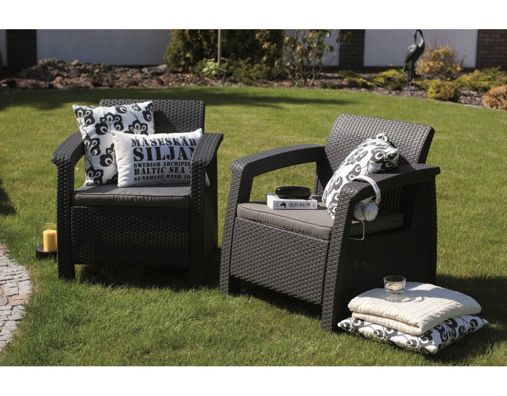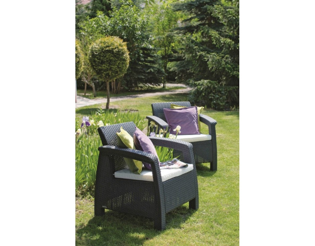 Комплект мебели фирмы KETER Корфу Дуо ― ответ на один из самых популярных запросов от наших клиентов. Многие хотят купить два кресла без столика или четыре кресла и один стол. Благодаря садовой мебели Corfu Duo вы сможете составлять комплекты для сада в любых количественных сочетаниях, так как кроме кресел в продаже двухместный диван Корфу, трехместный диван Корфу, а так же несколько вариантов столов: кофейный столик Корфу, столик-сундук Арика, а так же большой обеденный стол Мелоди.