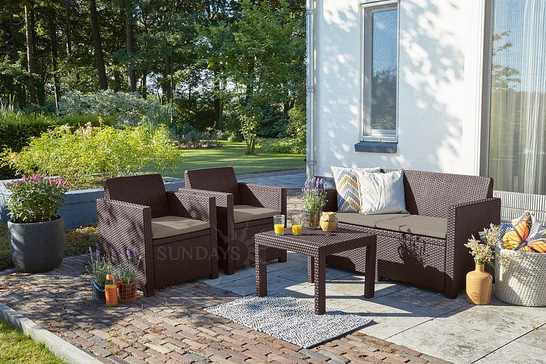 Комплект мебели Keter Alabama set - элегантная мебель с текстурой, напоминающей плетение из ротанга, который состоит из двух кресел, дивана и квадратного стола. Модель комплектуется мягкими подушками в стильной цветовой палитре. Данный комплект отлично впишется в интерьер любого летнего кафе, ресторана или дачного участка. Комплект изготовлен из прочного погодостойкого пластика, имитирующего ротанг. Благодаря стойкому полипропилену цвета не выгорают на солнце и не бледнеют со временем. Чехлы на подушках выполнены из плотной ткани, так же устойчивой к атмосферным явлениям.