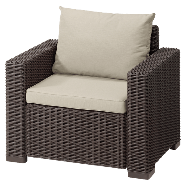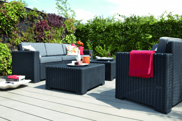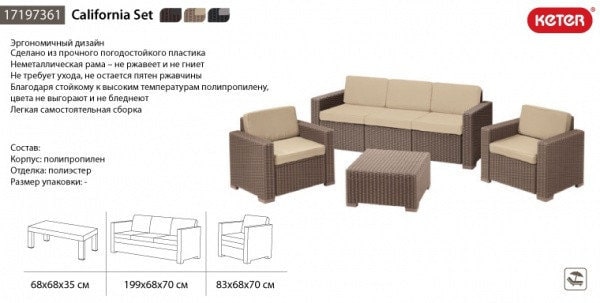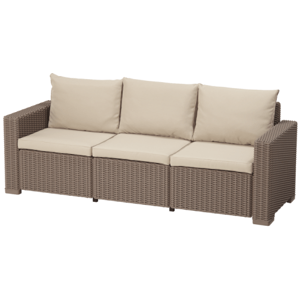 Комплект мебели California 3 Seater – это самый удобный комплект мебели из искусственного полиротанга производства фирмы Keter. Широкий диван позволяет поместится большому количеству людей, а высокие спинки мебели создают прекрасные условия для отдыха на открытом воздухе.