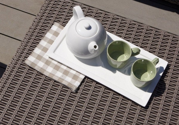 Благодаря стойкому полипропилену цвета не выгорают на солнце и не бледнеют со временем. Чехлы на подушках выполнены из плотной ткани бежевого цвета, так же устойчивой к атмосферным явлениям.
