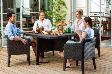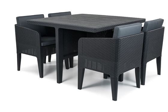 Комплект садовой мебели Columbia dining set (4 кресла +стол) , состоящий из 5 элементов, характеризуется исключительно современным и элегантным дизайном - вдохновленным натуральным ротанговым плетением.
