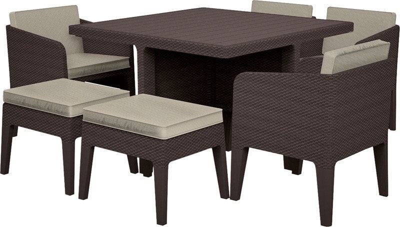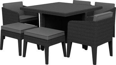 Комплект садовой мебели Columbia dining set (4 кресла, 2 табурета, стол) - современный и элегантный набор, прочный и комфортный. Четыре глубоких кресла с мягкими подушками, а также 2 табурета, выполняющие роль пуфов, обеспечат максимальный комфорт.