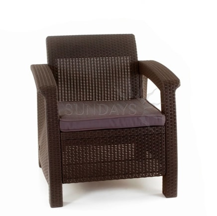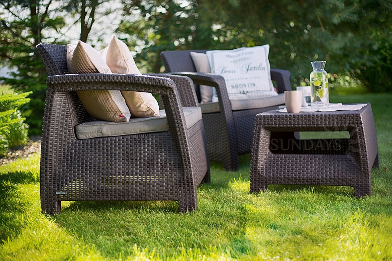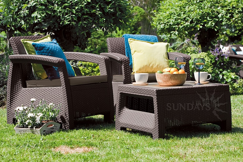 Комплект мебели Keter Corfu weekend set - красота и элегантность в одном наборе. Компактная форма стеллажа и оптимальные размеры набора позволяют оформлять также и небольшие садовые и балконные пространства. Комплект состоит из столика и двух кресел с мягкими подушками. Элегантность, удобство и эргономика - это гарантия удовольствия от отдыха на свежем воздухе. Комплект изготовлен из прочного погодостойкого пластика, имитирующего ротанг. Благодаря стойкому полипропилену цвета не выгорают на солнце и не бледнеют со временем. Чехлы на подушках выполнены из плотной ткани, так же устойчивой к атмосферным явлениям.