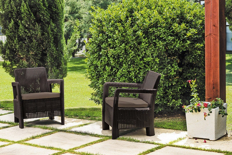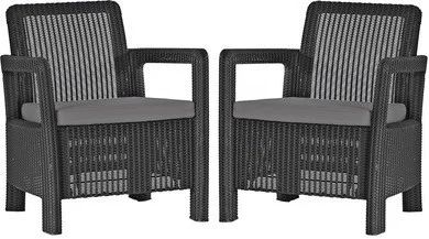 Набор состоит из двух кресел. Мебель отличается высокой прочностью и стойкостью к воздействию погодных условий.