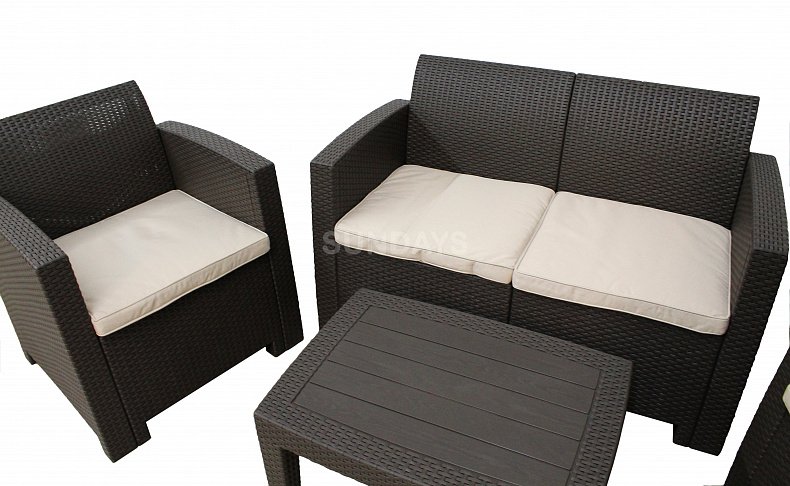 Комплект садовой мебели Sundays SF2-4P создан специально для теплого и уютного времяпровождения в кругу близких. Мебель выполнена из прочного погодоустойчивого пластика с имитацией плетения. Мебель Sundays SF2-4P не боится дождя или снега, не выгорает на солнце, прекрасно переносит перепады температур. Мягкие подушки выполнены из прочного полиэстера, чехлы имеют замки. Отличительной особенностью данной мебели является моментальная и простая сборка, а так же данная модульная мебель легко компонуется между собой исходя из ваших потребностей. Малый вес позволит без усилий перемещать мебель по саду или террасе. Комплект состоит из двухместного дивана, двух больших кресел и журнального столика. Все предметы мебели можно мыть мойкой высокого давления.