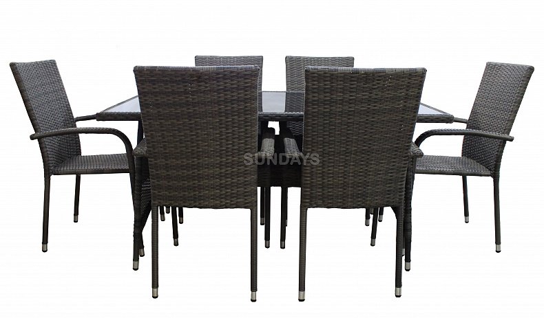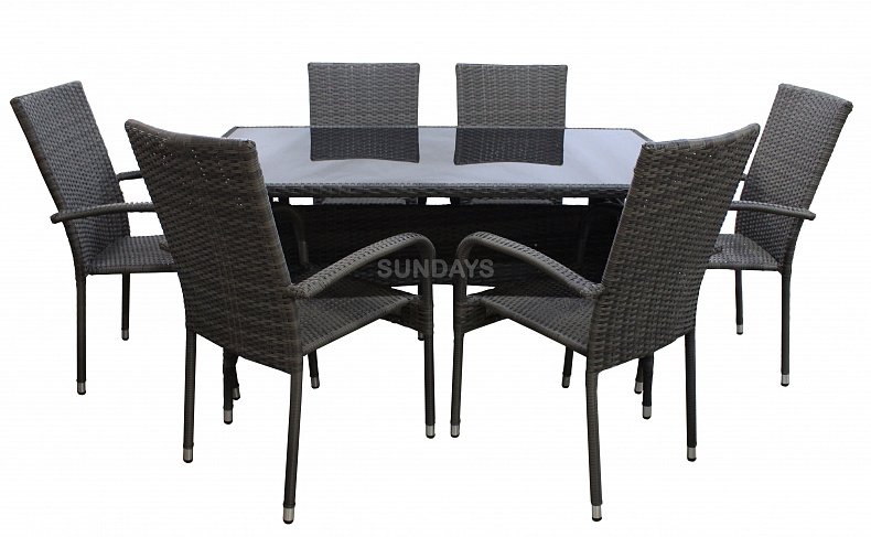 Комплект садовой мебели Sundays L13-D1017A представляет собой большой обеденный стол размером 150х90см со столешницей из закаленного темного стекла толщиной 5мм и шесть стульев с удобными широкими подлокотниками. Каркас мебели выполнен из прочной стальной трубы и оплетен искусственным ротангом коричневого цвета. Все материалы устойчивы к различным погодным условиям - мебель Sundays не выгорает на солнце, отлично переносит осадки и многие годы сохраняет свой первозданный вид. Стулья штабелируются для компактного хранения или транспортировки.