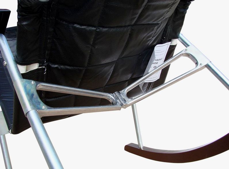 Имеет обивку из искусственной кожи (или ткани) черного, коричневого цвета, пластиковые подлокотники и полозья из плотного дерева. Каркас выполнен из легкой и прочной стальной трубки и, несмотря на легкость конструкции, кресло выдерживает достаточно большую нагрузку. Изделие имеет простой и надежный механизм складывания.