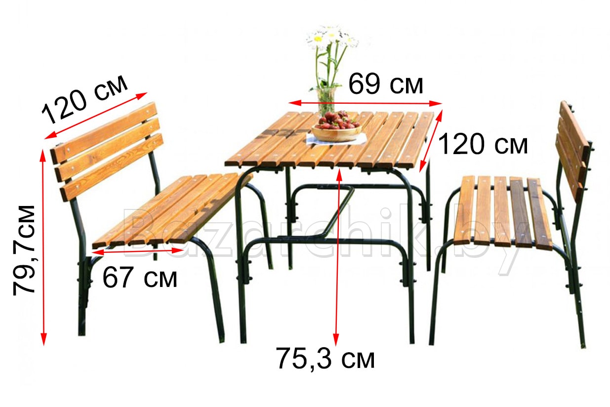 Набор дачной мебели Встреча с931 - это прекрасный всепогодный вариант для дачи. Металлическое основание имеет полимерное покрытие, устойчивое к солнечным лучам, а дерево - влагостойкую пропитку. Компактные размеры данного комплекта (1200х690 мм) прекрасно подойдут для установки даже на небольшом дачном участке.