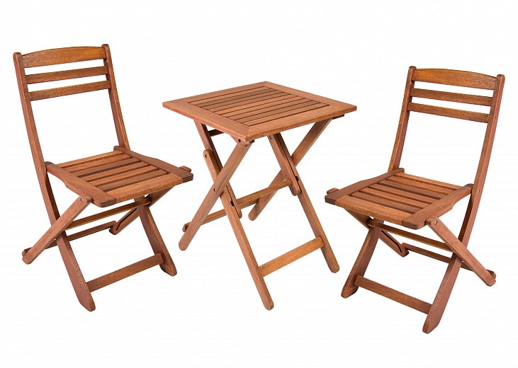Практичный складной комплект, состоящий из стола и двух стульев, изготовлен из натурального и экологичного материала - красного дерева меранти. Комплект мебели имеет простой и функциональный дизайн, и при переноске и хранении не доставит неудобств благодаря складной конструкции. Древесина меранти не только выгодно отличается изящным внешним видом с фактурным рисунком, но также практична в использовании: дерево очень прочное, устойчиво к атмосферным воздействиям, цвет не изменяется с течением времени.