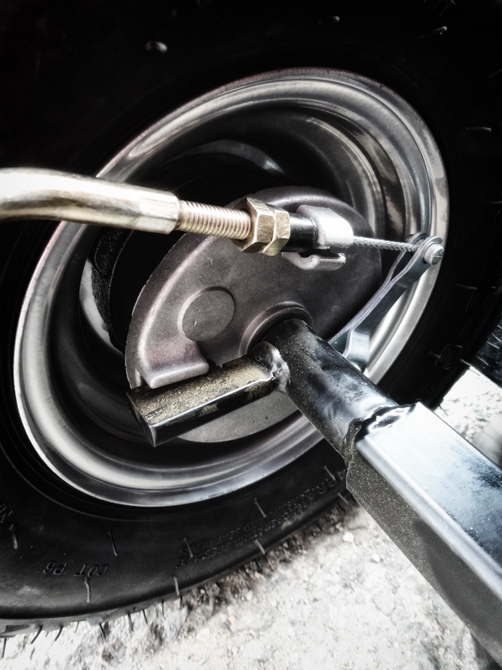 Zigzag GG 15 барабанный тормоз Левое колесо оборудовано барабанным тормозом, который позволяет зафиксировать колесо и начать эффективную и безопасную работу с резчиком