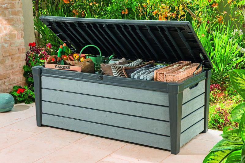 Большой вместительный сундук (объем – 455 л!) – идеальное решения Вашего сада! Сфера применения данной модели очень широка, ведь в нем можно хранить не только подручные аксессуары для отдыха, подушки , пледы и прочее, а также инвентарь для работы в саду, приспособления для очистки бассейна и многое другое. Преимуществами сундука Brush являются современный дизайн, внешняя оригинальная текстура поверхности, напоминающее натуральное дерево, а самое главное - сундук может быть использован в качестве скамьи.