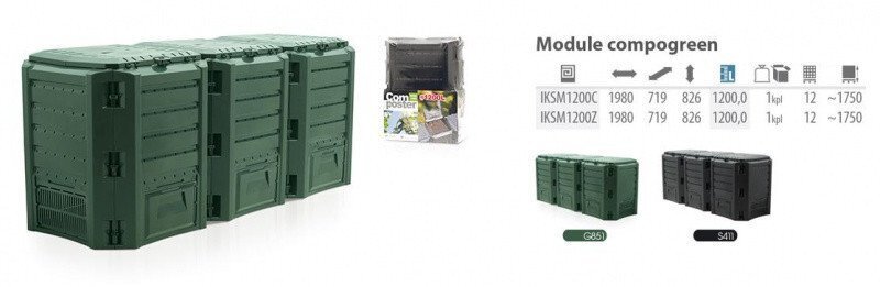 Compogreen 1200л - состоит из 3-х модулей, общей мощностью 1200 л. Компостер отличается хорошей вентиляцией, которая обеспечивает максимальное распределение биологических отходов. Прочная конструкция с высокой устойчивостью к погодным условиям.Легкая сборка и разборка.Изготовлен из погодостойкого пластика высокой прочности. Эстетическая форма компостера сделает ваш сад чистым, опрятным и уютным. Скошенная трава, сено, солома, ветви, отходы продуктов, кожура от овощей и фруктов, кофе, чай яичная скорлупа - могут быть обработаны в компостере.