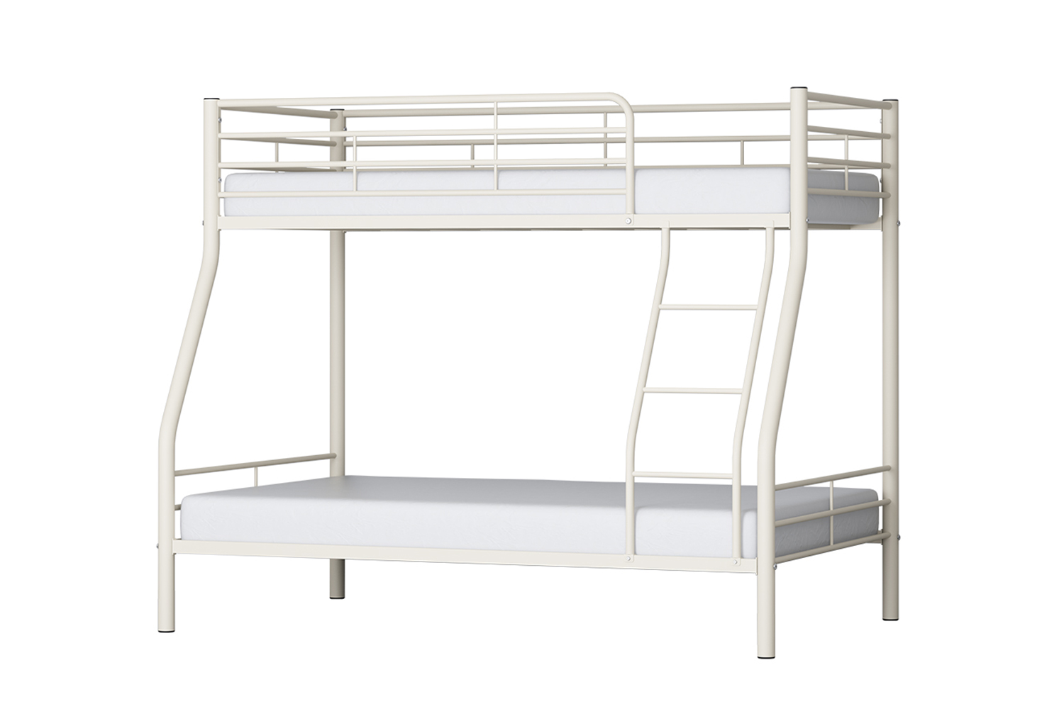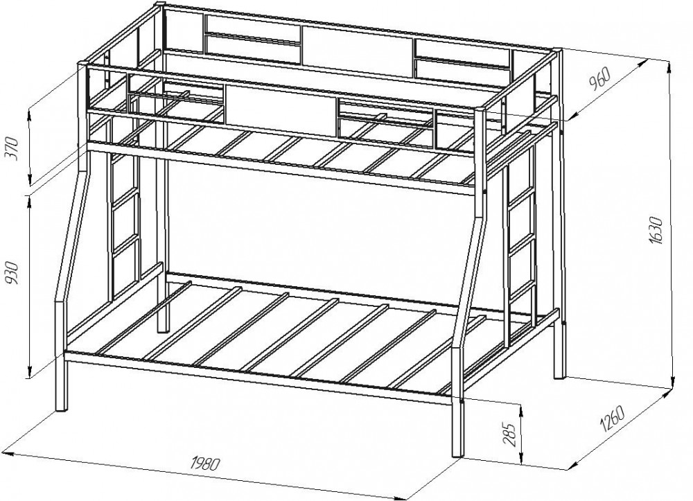 Металлическая двухъярусная кровать с широким спальным местом внизу. Возможна многократная сборка и разборка кровати.