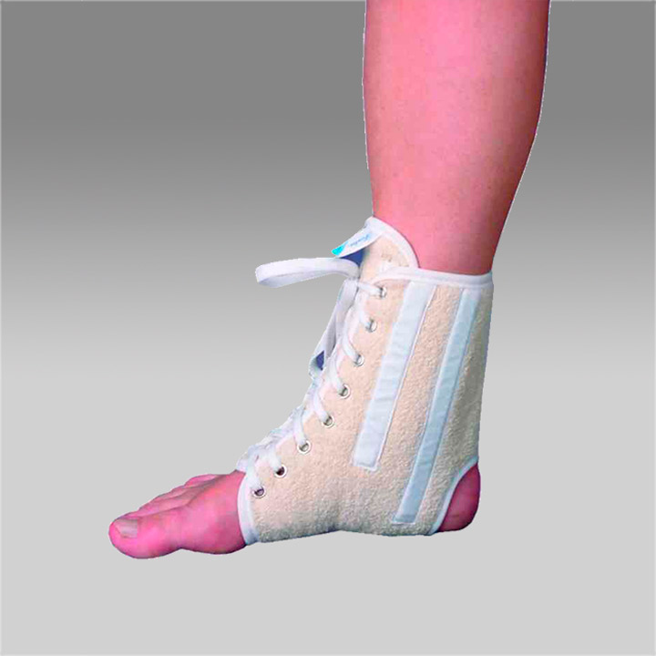 Фиксатор снабжен шнуровкой, что позволяет использовать его при наличии отеков. Боковые ребра жесткости фиксируют и стабилизируют голеностопный сустав и нижнюю треть голени.