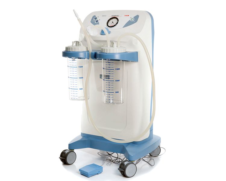 NEW HOSPIVAC 350 - хирургический аспиратор, предназначенный для аспирации различных биологических жидкостей (кровь, слизь, экссудат и т.д.), работающий от электрической сети 230V 50Hz. Установлен на тележку с 4 антистатическими колесами, 2 из которых оснащены тормозными механизмами. Аппарат специально разработан для длительного использования и легкой транспортировки. Благодаря своим техническим характеристикам, аппарат идеально подходит для использования в условиях стационара, при гинекологических вмешательствах и пластической хирургии (липосакция). Аппарат изготовлен из высокопрочного не проводящего электричество пластика. Согласно требованиям безопасности Евросоюза, аппарат снабжен автоклавируемой емкостью с предохранительным клапаном, полностью выполненной из поликарбоната, регулятором уровня аспирации и вакуумным индикатором на передней панели. Доступны различные модификации аппарата: с педальным управлением, регулировкой потока, переключателем емкостей.