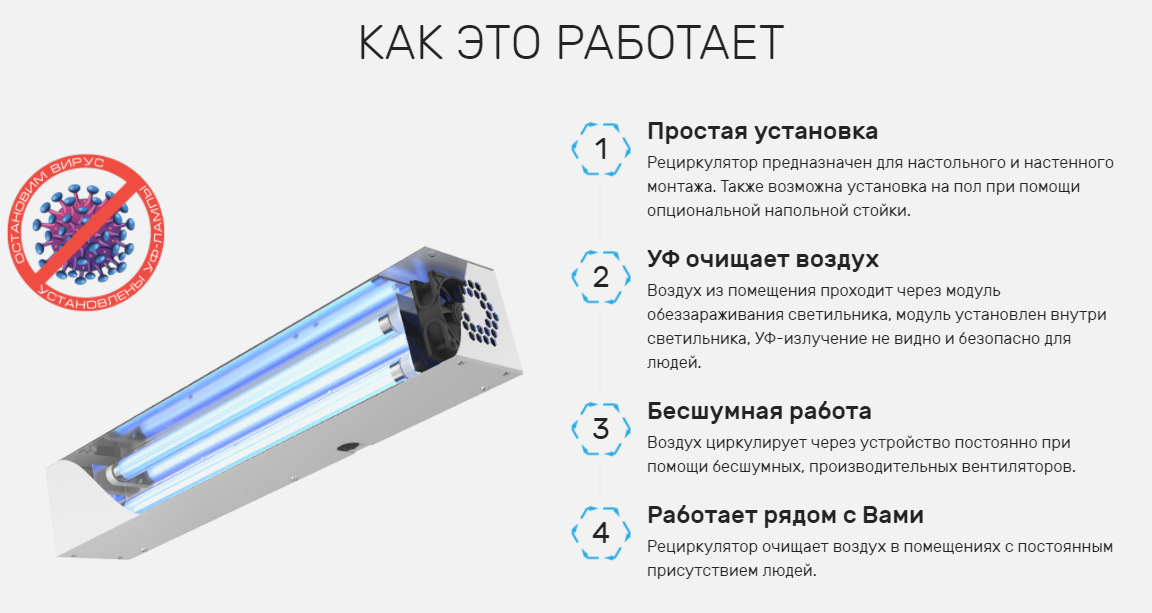 АНТИВИРУС – рециркулятор нового типа для борьбы со вирусами в квартирах, офисах и общественных помещениях. Устройства обеззараживают воздушную среду при помощи установленных УФ-ламп, бактерицидный поток от ламп распространяется в замкнутом пространстве рециркулятора через которое принудительно при помощи вентиляторов прокачивается воздух из помещения. Устройство отличается высокой производительностью и компактными размерами. Рекомендуется для помещений площадью до 45 м2. Предназначен для настольного и настенного монтажа. Также возможна установка на пол при помощи напольной стойки (не идет в комплекте). Бесшумная работа - воздух циркулирует через устройство постоянно при помощи бесшумных, производительных вентиляторов.