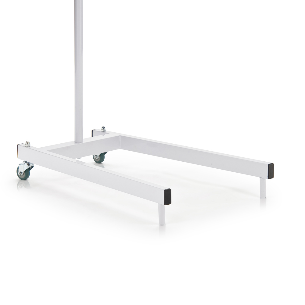 Основание стойки оснащено двумя стационарными опорами спереди и двумя колесами сзади.