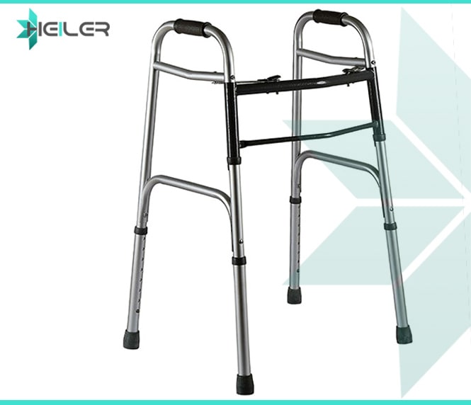 Распространенная модель алюминиевых ходунков для пожилых и инвалидов с опорой на четырех ножках. Есть регулировка высоты. Складная, удобная для транспортировки и хранения конструкция. Максимальная нагрузка 130 кг. Два черных горизонтальных барьера, соединяющие две стороны позволяют стоять над унитазом. Ходунки для пожилых Heiler 2 в 1, обладают функцией шагания, так и функцией фиксированного положения опоры.