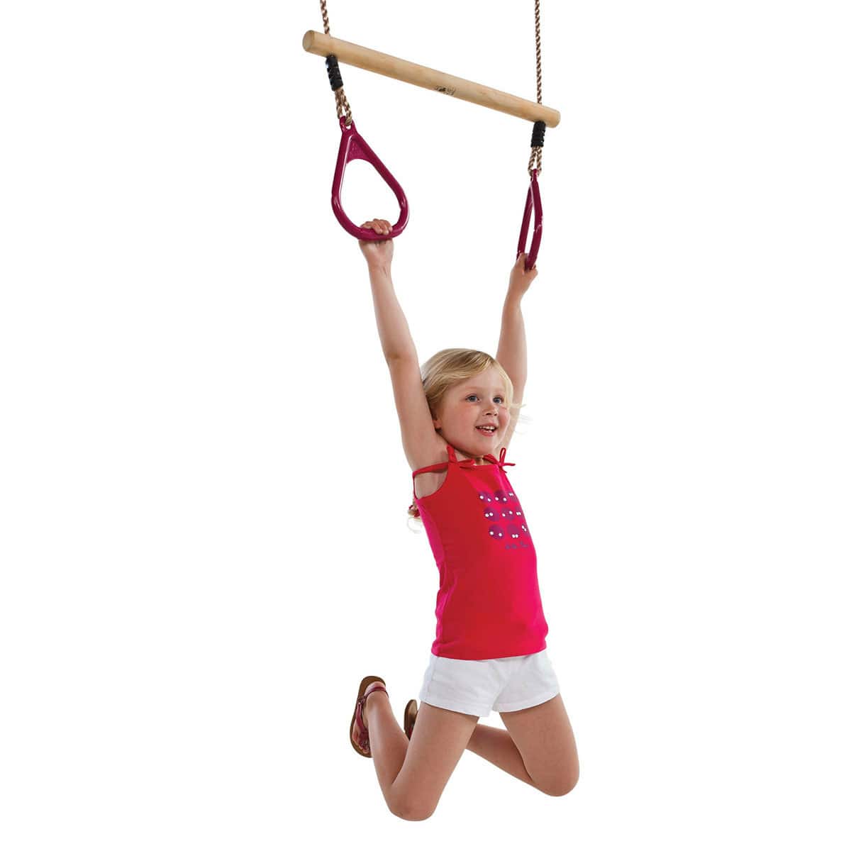 Деревянная трапеция с кольцами из пластика - это игрушка для маленьких акробатов, демонстрирующих свои трюки на трапециях, трапециях с обручами, канатных мостах и канатных дорогах. Она дает необходимую нагрузку на все группы мышц, а также замечательно развивает цепкость, ловкость и гибкость. Трапеция изготовлена из древесины твердых пород, безопасных для использования детьми и пропитана антисептиком на основе меди. Кольца изготовлены из пластика РР, методом литья под давлением.