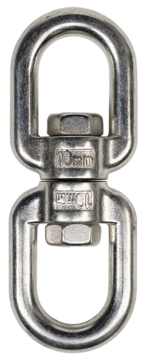 Вертлюг КВТ используется в различных конструкциях и может быть открытого и закрытого типа. Имеется шкант с врезанной головкой и контргайкой М6. Выполнен из нержавеющей стали, согласно высоким требованиям, применяемым к данным элементам. Вертлюг свободно вращается вокруг своей оси на 360°, предотвращая закручивания цепи, каната или веревки.