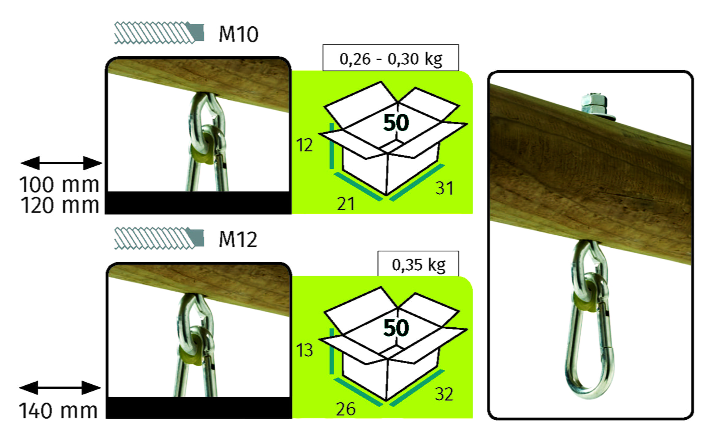 Крепление для качелей или сквозной подвес для качелей Тип О используется для крепления подвесных качелей. Поставляется с нейлоновым подшипником, обладающим более высокими характеристиками, чем полипропиленовые втулки. Все подвесы KBT выполнены из оцинкованной стали согласно жестким требованиям ЕС. Крепеж подходит для крепления любых изделий. Допустимый максимальный вес на 1 крепеж - 80 кг.