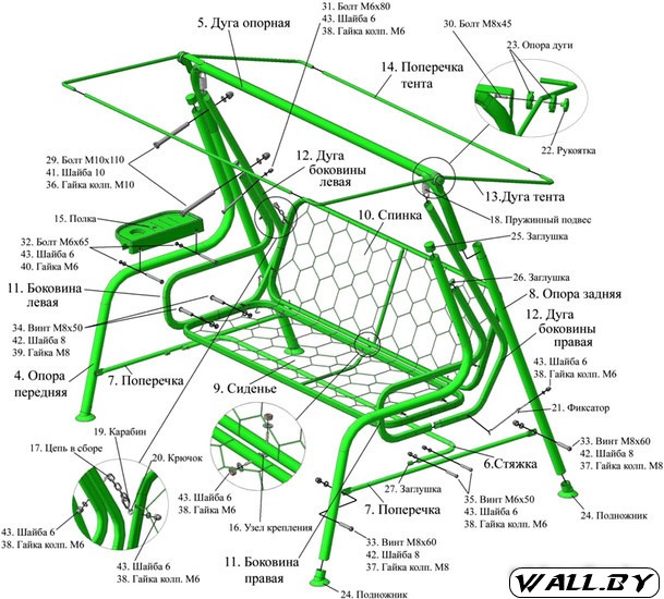 Регулировка спинки: осуществляется звеньями цепи на требуемый угол наклона, с возможностью фиксации в горизонтальном положении.