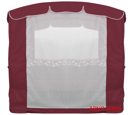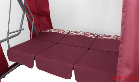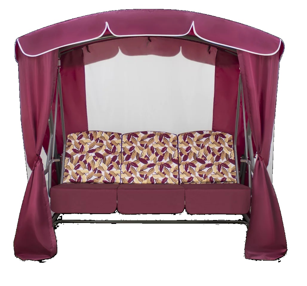 Максимальная нагрузка, кг: 300 Диаметр трубы, мм: 40 Цвет и материал тента: Бордовый Оксфорд 210 Комплектация: 3 подушки-кресла (с оборкой, закругленный верх), тент Люкс с антимоскитной сеткой, 2 металлических тентодержателя. Количество мест: 3 Подстаканник: нет Москитная сетка: да Регулировка спинки: да
