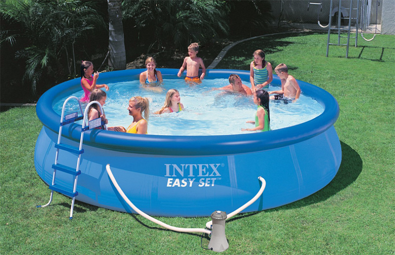 Если рядом с Вашим участком нет водоема, его легко можно соорудить прямо в саду. Надувной бассейн Intex 26168 Easy Set - это маленький пруд под Вашими окнами! Большой бассейн Easy Set в комплектации DELUXE укомплектован фильтром-насосом, лестницей, тентом и подстилкой. Данная модель бассейна - прекрасная альтернатива сборным каркасным бассейнам. Стенки бассейна сделаны из трех отдельных слоев: два слоя плотного винила и один - внешний - полиэстр для особой прочности. Борта бассейна поддерживаются надувным кольцом, которое поднимается, по мере заполнения бассейна. Для установки бассейна требуется плоская, горизонтальная площадка. Процесс сборки и подключение бассейна занимает не более 20 минут. У бассейна 26168 Easy Set имеется сливной клапан, который можно присоединить к садовому шлангу и слить воду в удобное место. Бассейн оснащён фильтр-насосом с картридж-фильтром. Также в комплекте подстилка для защиты дна бассейна от механических повреждений и сглаживания неровности поверхности и тент для защиты бассейна