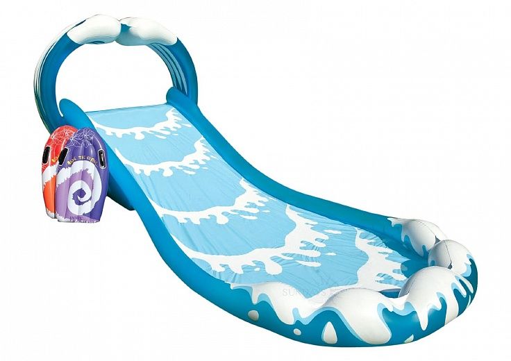 Intex 57469NP – это замечательная надувная горка с мини-бассейном в конце спуска. Горка «Прокатись по волнам» позволит вашему ребенку побывать на месте настоящего серфера. В комплектацию включены 2 надувные доски с пластиковыми ручками, которые разнообразят спуски ребят с горки и сделают их ещё веселее. Горка Интекс 57469NP способна выдержать довольно большую нагрузку: предельный вес – 80 кг. Это позволит даже взрослому порезвиться вместе со своими детьми.