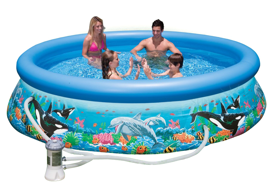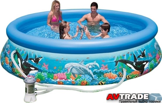 Intex 28126/54902 "Риф океана" – это вместительный надувной бассейн из серии Изи Сет. Все бассейны этой серии отличаются быстрой и ненакладной системой установки и надувания. Без каких-либо специальных принадлежностей (нужен лишь насос) и особых навыков вы сможете самостоятельно установить этот бассейн меньше чем за 20 минут. В комплект с бассейном входит картриджный фильтрующий насос, который при циркуляции воды вылавливает из нее все загрязнения (листья, пыль и т.д.).