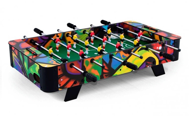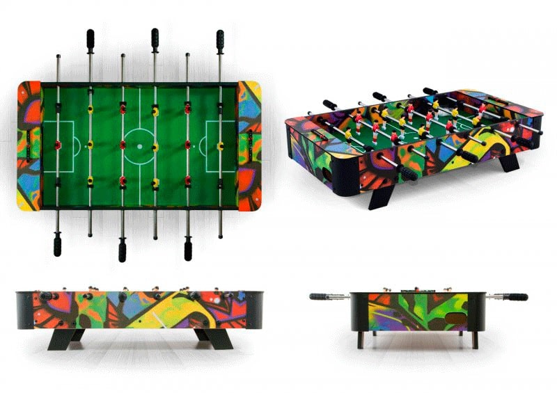 Все элементы стола напоминают стадион и создают футбольный антураж, расцветка выполнена в стиле граффити. Стол выполнен из высокопрочного МДФ, углы корпуса закруглены, эргономичные ручки обеспечивают удобный захват. Настольный футбол оснащен двумя механическими счетчиками очков, в комплект входят инструменты для сборки, инструкция, 2 мяча и по 7 игроков в каждой команде.