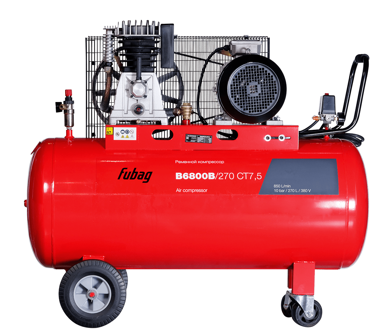 Ременной поршневой компрессор FUBAG B6800B/270 CT 7.5 широко используется в авторемонтной и строительной сферах для питания сжатым воздухом различного пневмоинструмента. Ременной компрессор оборудован ресивером на 270 литров, что существенно увеличивает интенсивность рабочих циклов. Благодаря большим устойчивым колесам и резиновой насадке на ручку транспортировка компрессора максимально удобна. Качественная и непрерывная работа компрессора B6800B/270 CT 7.5 гарантирована благодаря чугунной гильзе цилиндра и алюминиевой крышке цилиндра с большими охлаждающим ребрам.
