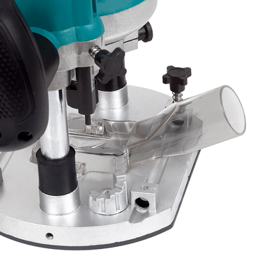 В комплект входят циркуль и циркульная направляющая. Размер конусных цанг из закаленной стали — 8мм и 12мм. Имеется ключ для зажима цанги, дополнительный комплект щеток. Используя направляющую втулку можно фрезеровать на разном удалении от края и под любым углом к нему. Благодаря адаптированному подключению пылеотвода фрезера к пылесосу, решается проблема запыления в рабочем помещении.